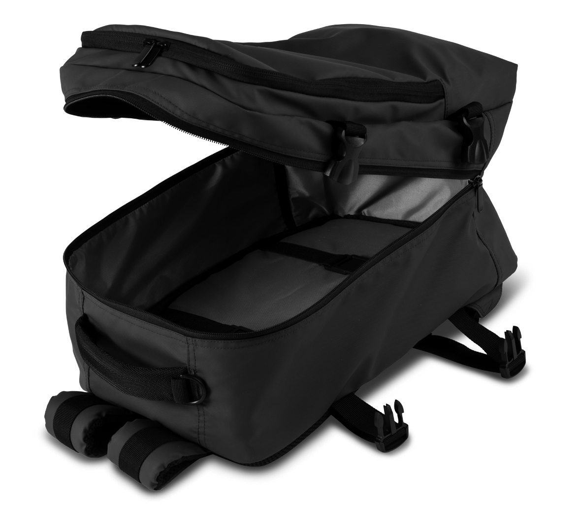 - Prostorná hlavní kapsa s dvoucestným zipem, má uvnitř kompresní popruhy pro upnutí oblečení