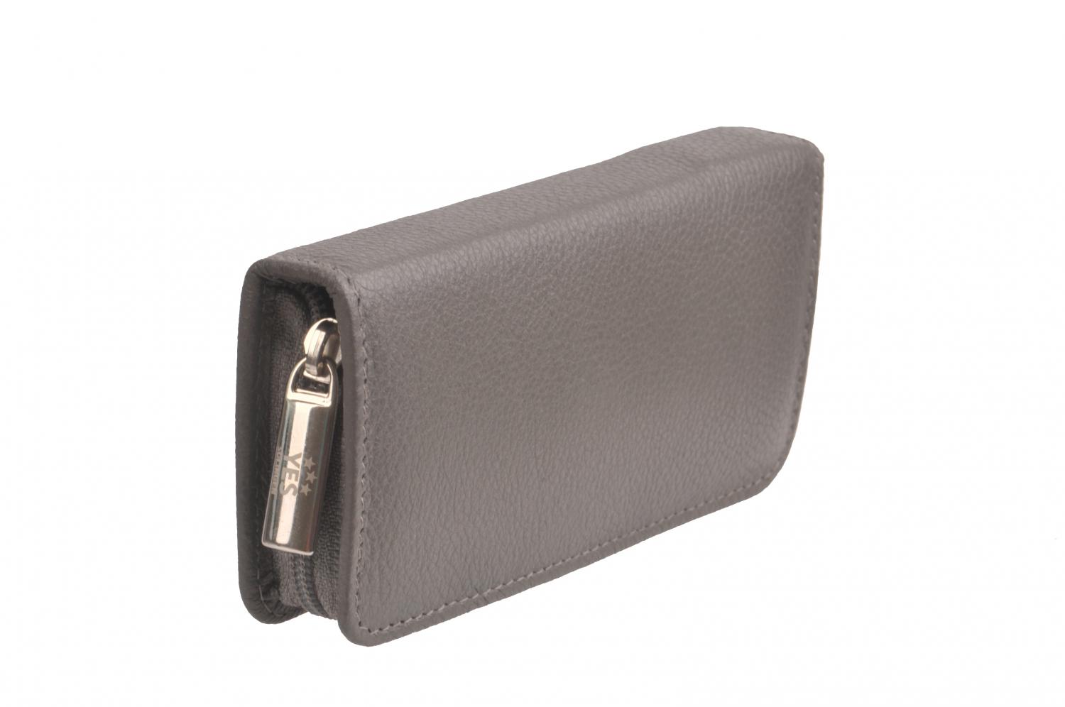 Pouzdro manikúry je vyrobené z elegantní šedé kůže, uzavírání je na kovový zip ve stříbrné barvě.