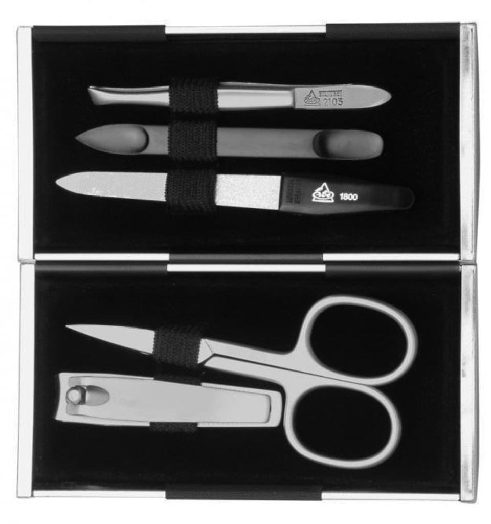 Manikúra v elegantním pouzdře, které je vyrobené z nerezu kombinované s černou látkou. Manikurní náčiní vyrábí Německá firma Erbe Solingen, která vás nadchne řemeslným zpracováním, nadčasovým designem i dokonalými nástroji. Soupravy na manikúru tradiční německé značky Erbe Solingen se vyznačují vysokou kvalitou zpracování.
