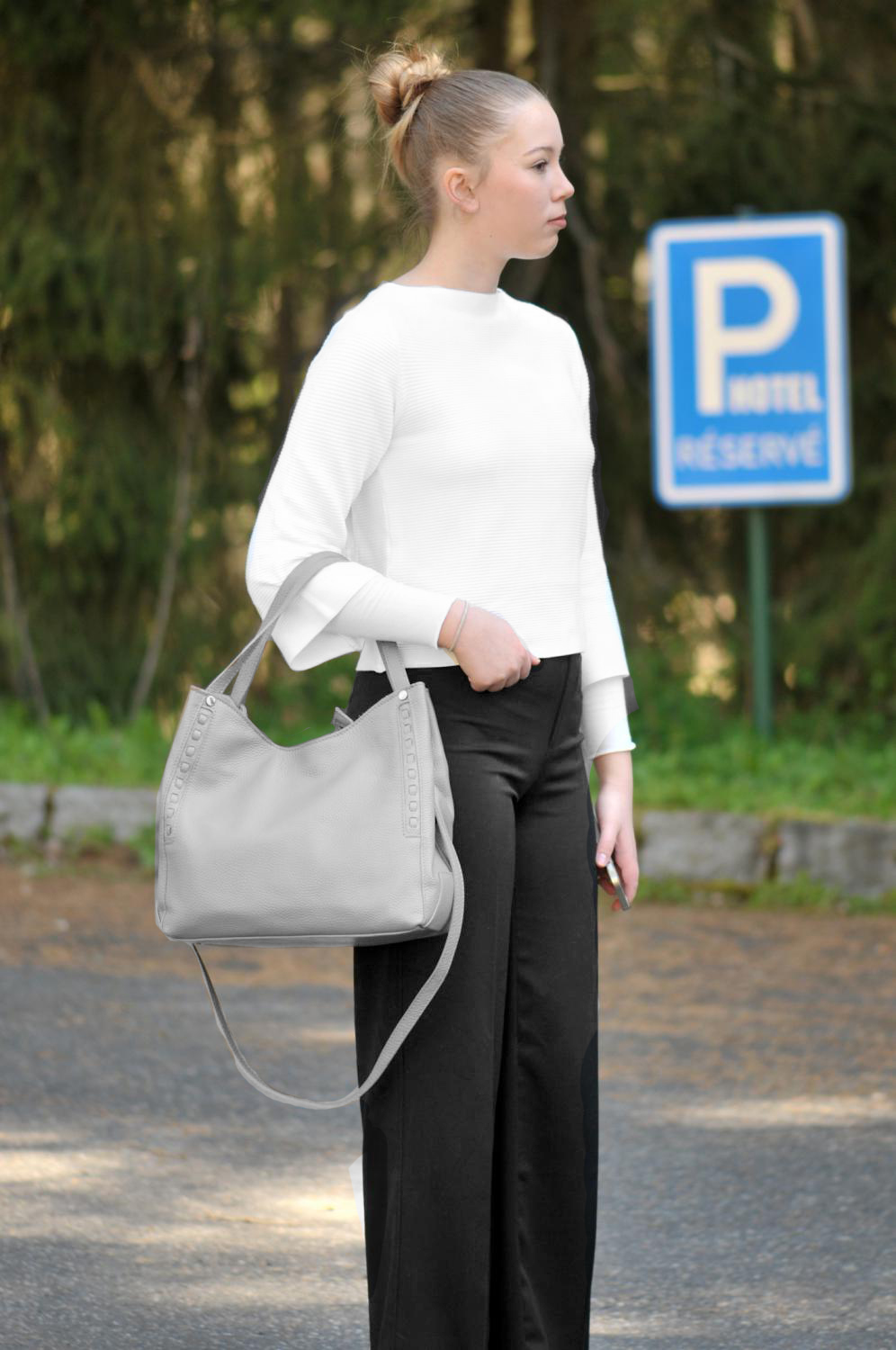 Elegantní kožená kabelka italské značky MaxFly Vám nabídne dostatek prostoru pro uložení vašich osobních věcí. Pokud potřebujete v kabelce nosit krabičku s obědem, diář, náhradní oblečení bude tato kabelka pro Vás ta pravá. Kabelka je pěkně členěná, má jednu širokou hlavní kapsu rozdělenou na dvě stejně velké přihrádky. Výhodou kabelky je popruh na rameno, který si můžete jednoduše připnout. Maximální délka popruhu je 105 cm. Kabelku můžete nosit také v ruce, nebo rameni.