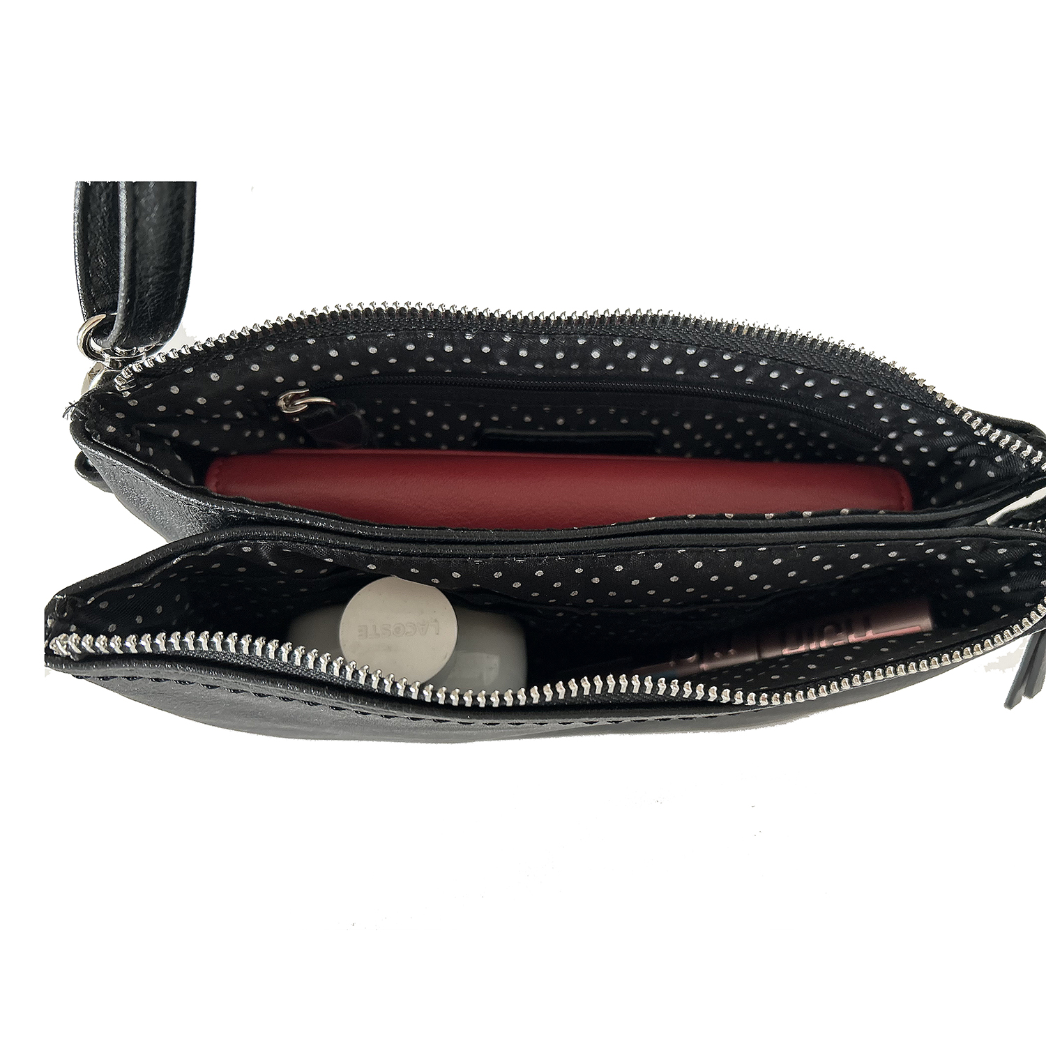 Kabelka Emmy má malé rozměry, proto ji můžete nosit jako organizer ve vaší kabelce. Při společenských událostech ji můžete nosit s poutkem na zápěstí. Na procházky městem si připněte dlouhý popruh a můžete ji nosit crossbody. I přes malé rozměry uložíte do kabelky malý deštník a dlouhou peněženku.