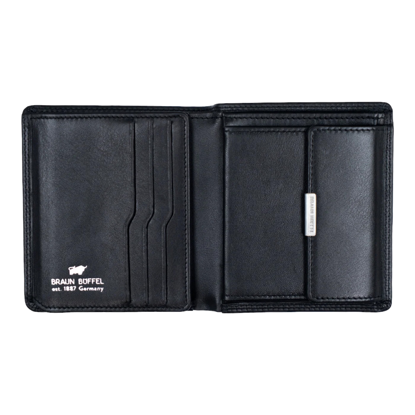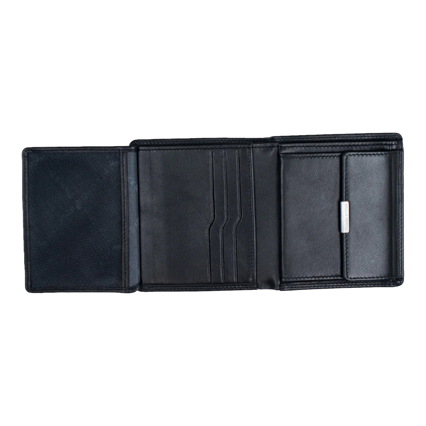 Vnitřní členění je navrženo tak, aby poskytovalo maximální přehled v kompaktním formátu. Peněženka nabízí šest přihrádek na karty, dvě další kapsy na doklady či účtenky a jedno prostorné přihrádky na bankovky. Boční výklopný díl obsahuje průhledné okénko vhodné pro občanský průkaz nebo doklady ve velikosti kreditní karty. Samostatná přihrádka na mince s klopou umožňuje rychlý přístup k drobným.