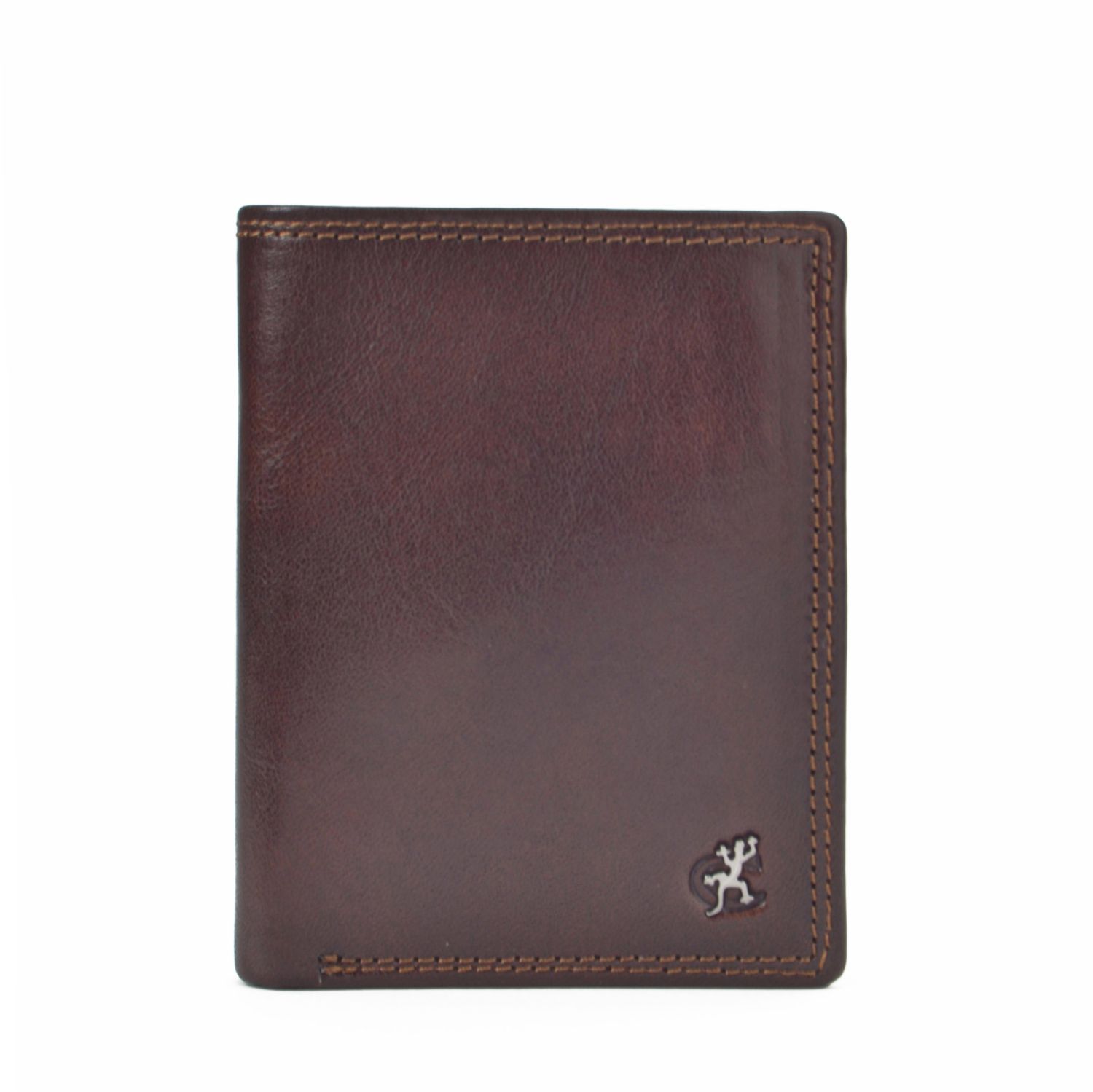 Elegantní pánská peněženka z pravé kůže s jemným leskem. Na přední straně ozdobena kovovým logem tvaru ještěrky.