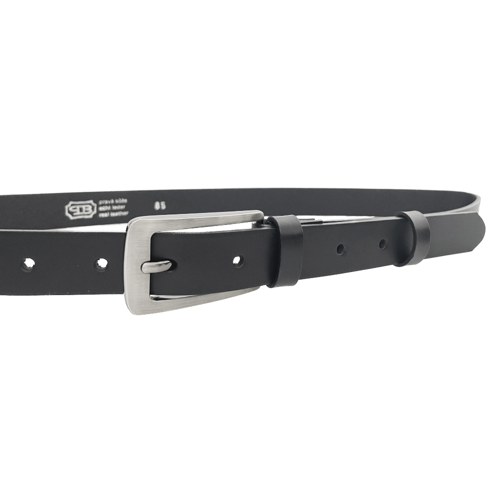 Černý dámský kožený opasek o šířce 25 mm má pěknou decentní sponu s povrchovou úpravou NKS (nikl satináto). Pásek je vyrobený z černé usně v moderní úpravě. Opasek má zabarvené hrany a upravený rub pásku, což zaručuje, že nedojde k zabarvení oděvu. Pásek není prošitý. Na výběr máte z pěti různých délek opasků. Prvotřídní kvalita od českého výrobce.