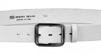 Dámský kožený opasek o šířce 40 mm má zajímavou sponu s povrchovou úpravou NKS (nikl satinato). Tato spona obsahuje nikl. Pásek je vyrobený z bílé matné usně se zcela přírodním charakterem. Opasek má zabarvené hrany a upravený rub pásku, což zaručuje, že nedojde k zabarvení oděvu. Pásek není prošitý a lze ho zkrátit pomocí šroubku, který spojuje opasek a kožený díl se sponou.