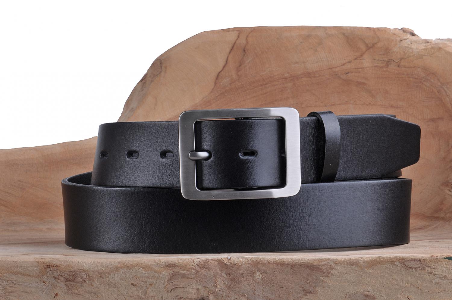 Černý kožený opasek o šířce 40 mm má zajímavou hranatou matnou sponu s povrchovou úpravou NKS (nikl satinato). Tato spona obsahuje nikl. Pásek je vyrobený z kůže. Opasek má zabarvené hrany a upravený rub pásku, což zaručuje, že nedojde k zabarvení oděvu. Pásek není prošitý a lze ho zkrátit pomocí šroubku, který spojuje opasek a kožený díl se sponou.