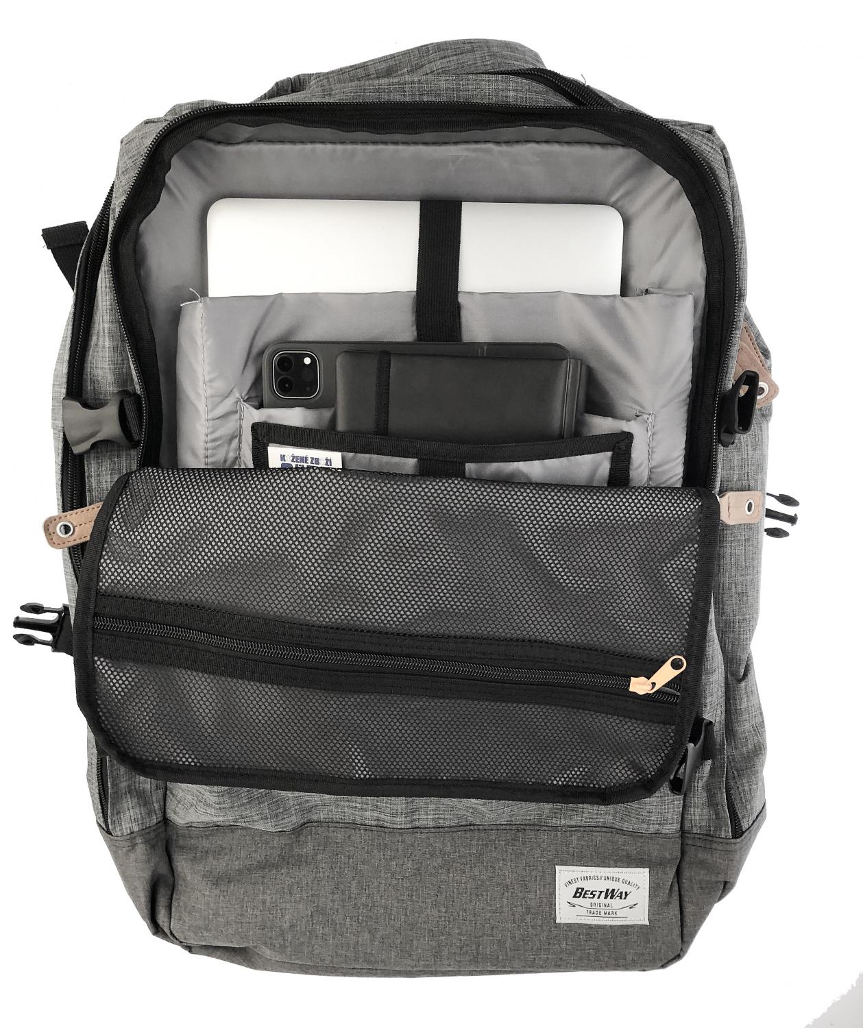 • Batoh má na přední straně praktickou větší kapsu s vypolstrovanou kapsou na notebook 17"   (max. rozměry 40 x 32 cm) a  přihrádku na tablet a praktický organizér na menší předměty jako jsou  např. cestovní doklady,  peněženku nebo mobilní telefon, do větší kapsy ze síťoviny můžete vložit i dokumenty formátu A4.