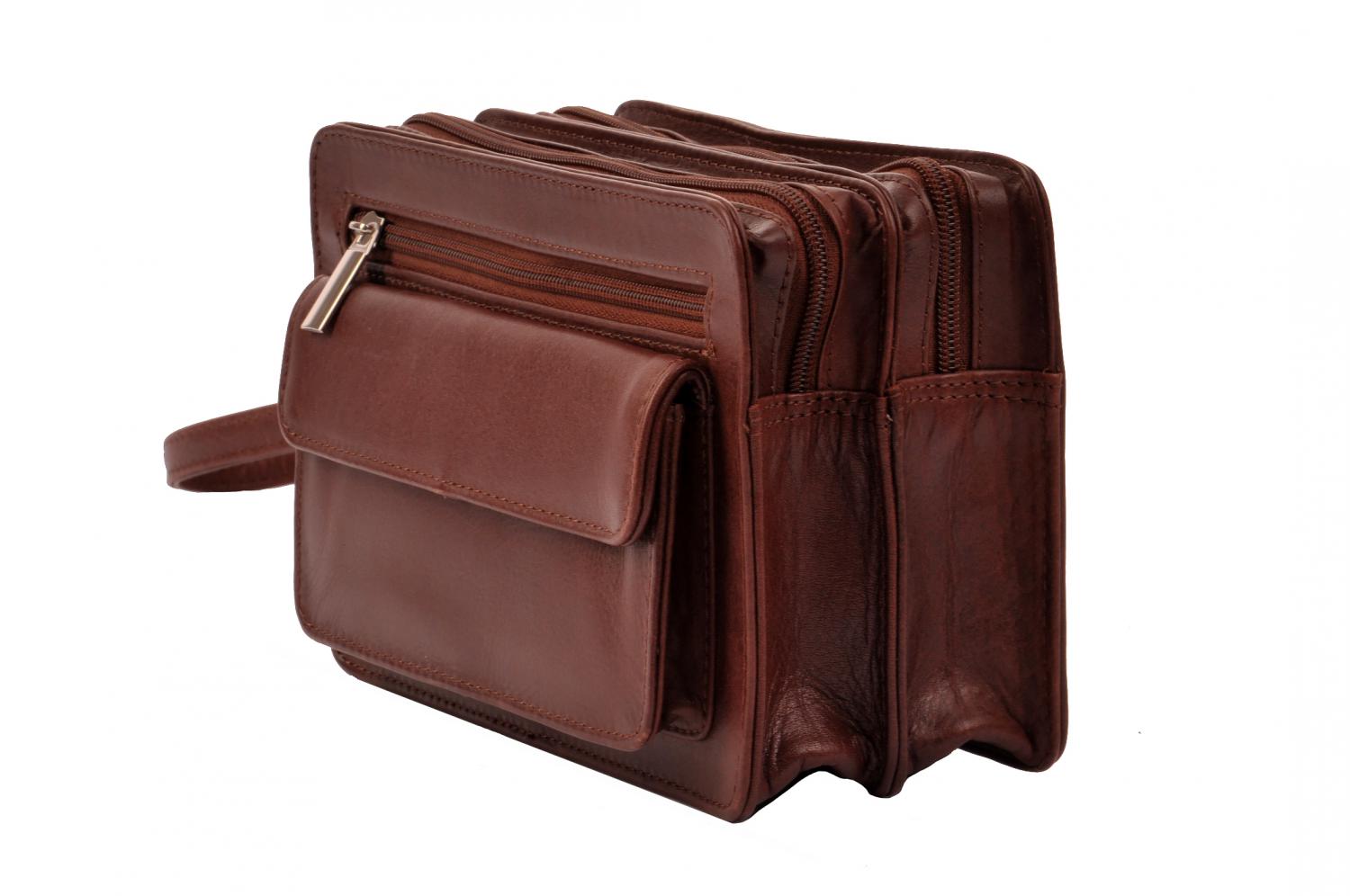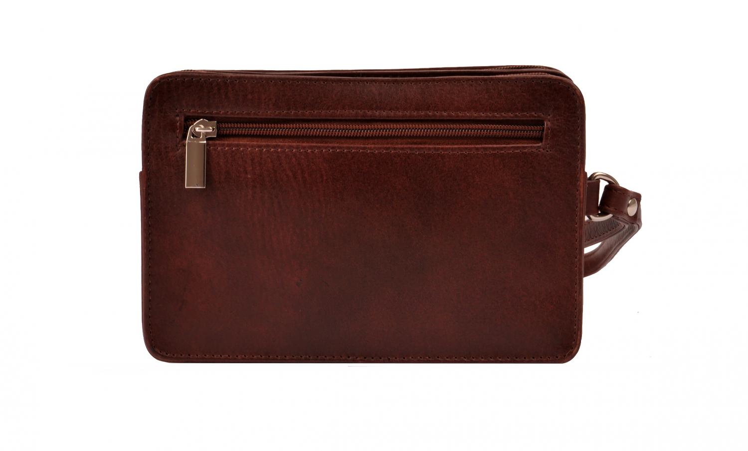 Hnědá kožená klíčenka se zipovou a klopnovou kapsičkou.