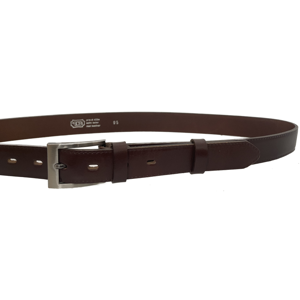 Hnědý pánský kožený opasek o šířce 30 mm má klasickou sponu s povrchovou úpravou NKS (nikl satinato). Tato spona obsahuje nikl. Pásek je vyrobený z hnědé hladké kůže se zcela patrnou strukturou. Opasek je vhodný na nošení při společenských událostech. Pásek má lakované hrany i rub opasku, což zaručuje, že nedojde k zabarvení oděvu. Opasek je prošitý a lze ho zkrátit pomocí šroubku, který spojuje pásek a kožený díl se sponou. Na výběr máte z různých délek opasků. Prvotřídní kvalita od českého výrobce.