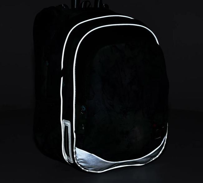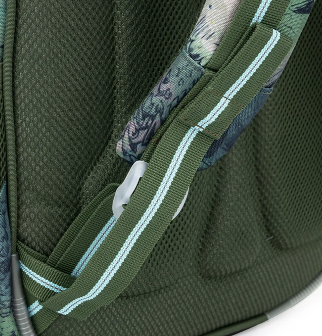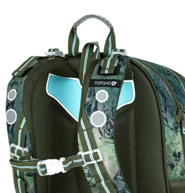 Záda batohu jsou tvořena z lehké tvarované pěny. Díky ergonomicky tvarovaným polstrovaným popruhům bude batoh pohodlně nosit i těžký náklad. Popruhy na záda školáčkovi nejdříve utáhněte ve spodní části na délku tak, aby batoh seděl na kosti křížové. Poté v horní části utáhněte popruhy směrem k zádům, aby od zad s těžkým nákladem neodstával. Dlouhé konce popruhů můžete díky magnetům připnout k tělu popruhu, aby nevlály kolem těla.